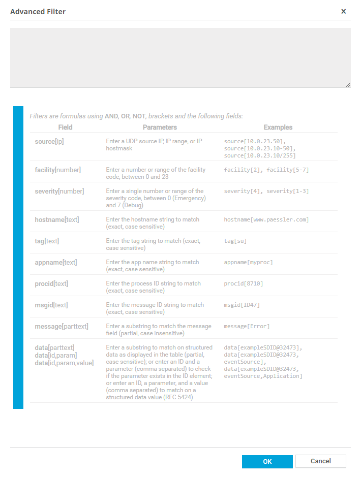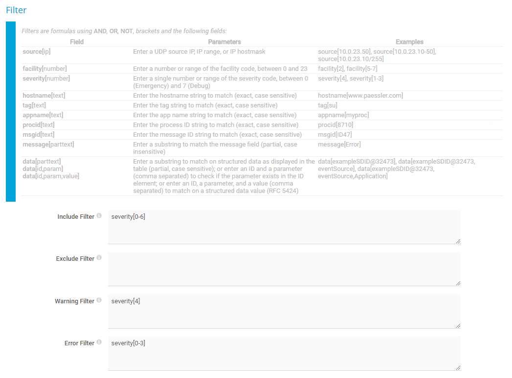 Use the syntax that is provided in the corresponding manual sections to define your individual filter rules: SNMP Trap Receiver sensor and Syslog Receiver sensor.