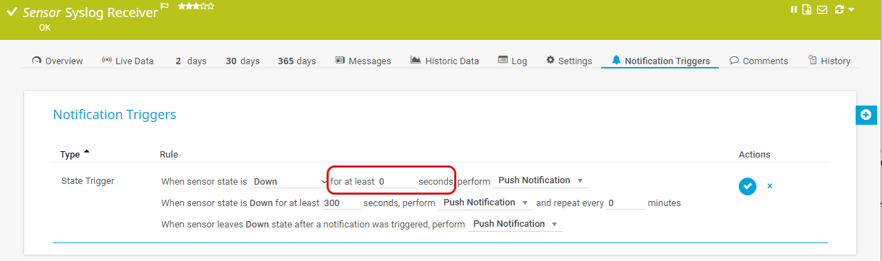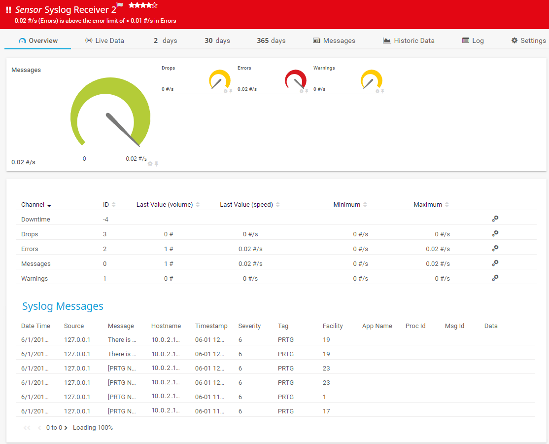By default, the warning and error channels of the Syslog and SNMP Trap Receiver sensors have a very low upper warning or error limit (0.00000001). The reason for this is that even when only one syslog or trap has been counted in the respective channel during a scanning interval, the overall status of the sensor will show this with the corresponding status. This way, you always recognize if there is something wrong on the monitored system.