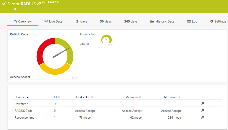 The RADIUS v2 sensor monitors a Remote Authentication Dial-In User Service (RADIUS) server according to RFC 2865. The sensor tries to authenticate at the server and shows the following: