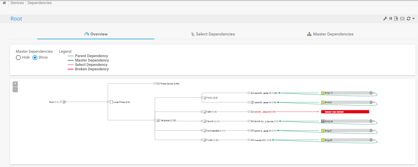 The Overview tab shows the device tree in the dependencies graph view with lines of different color connecting objects. The lines in the dependencies graph symbolize dependencies between the monitoring objects in the device tree. Additionally, a color code is used for the dependencies. You can also switch the dependencies view to table lists with the Select Dependencies and Master Dependencies tabs.